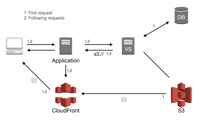 That was the caching of posters and thumbnails. The example I'll show for video files uses Amazon CloudFront to cache files on a Amazon S3 storage (see figure 3). In this case the request to Vidispine will return a S3 storage location, which is used to ask Amazon CloudFront to serve that file. If the file doesn't exist in Amazon CloudFront, it will be fetched from Amazon S3 on the first request, but in the following requests it will be served directly from Amazon CloudFront. The main difference is that noauth URLs to video files will only exist for 10 minutes, and then it will need to be refreshed again.