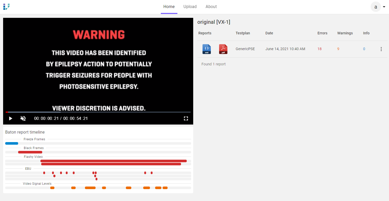 The VidiCore QC Theme is an application designed to visualize how a QC workflow can be built using VidiCore together with the Baton QC service in VidiNet. The application contains functions for uploading media files to VidiCore, starting QC jobs for files under VidiCore management, viewing QC results as timecoded metadata in the video player timeline, as well as the ability to download native Baton QC reports in PDF and XML formats.