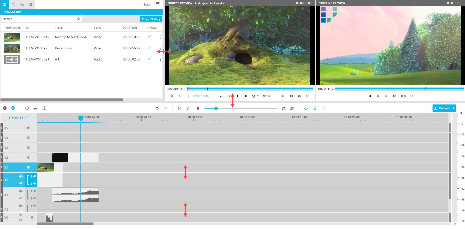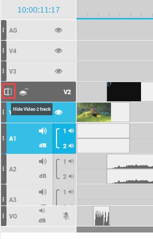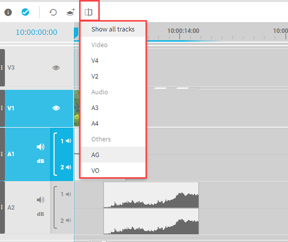 This will result in a minimized track that saves most of the screen size but still indicates the presence of segments inside the timeline. A result can look as follows, where the AG, VO and different audio and video tracks are hidden: