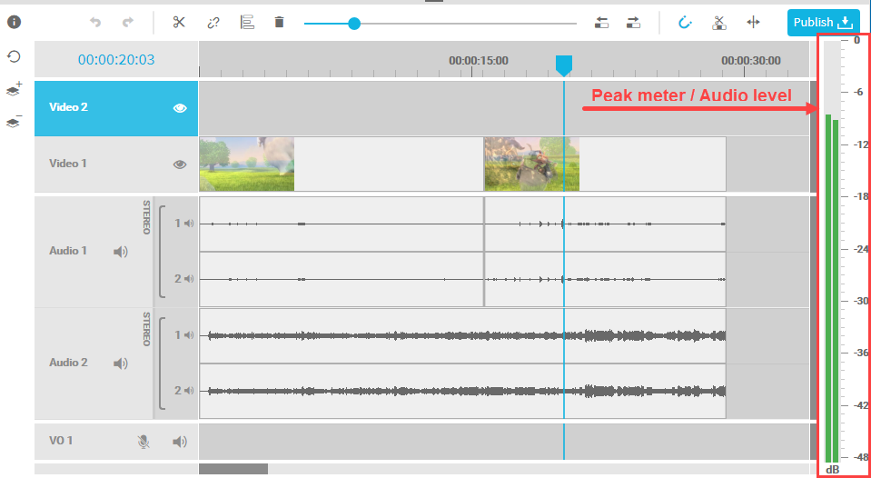 When adding multiple channels of different audio signals into a accumulated signal (mix), the mix will usually result in a signal with higher level than the single signals. This can lead to a mix higher than the maximum audio level allowed. As a result, the signal will be overdriven and the user hears clipping. This effect cannot be avoided by VidiEditor, as the level, compression and amount of audio channels mixed highly depends on the usage and media used. As a result, the user needs to ensure clipping is avoided. The peak meter in VidiEditor helps to indicate the level of the mixed signal: