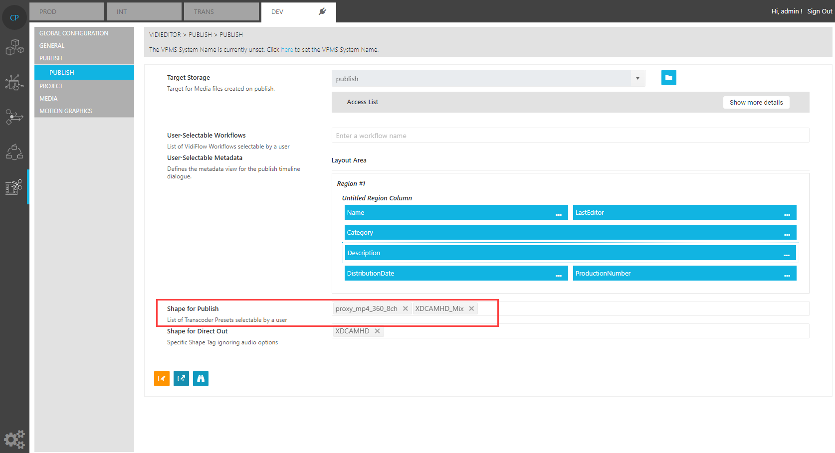 To publish a VidiEditor timeline, the VidiCoder needs to get an information about the desired output format for the newly created file. As this might differ, a list of shape tags acting as transcoder preset can be configured in ConfigPortal: