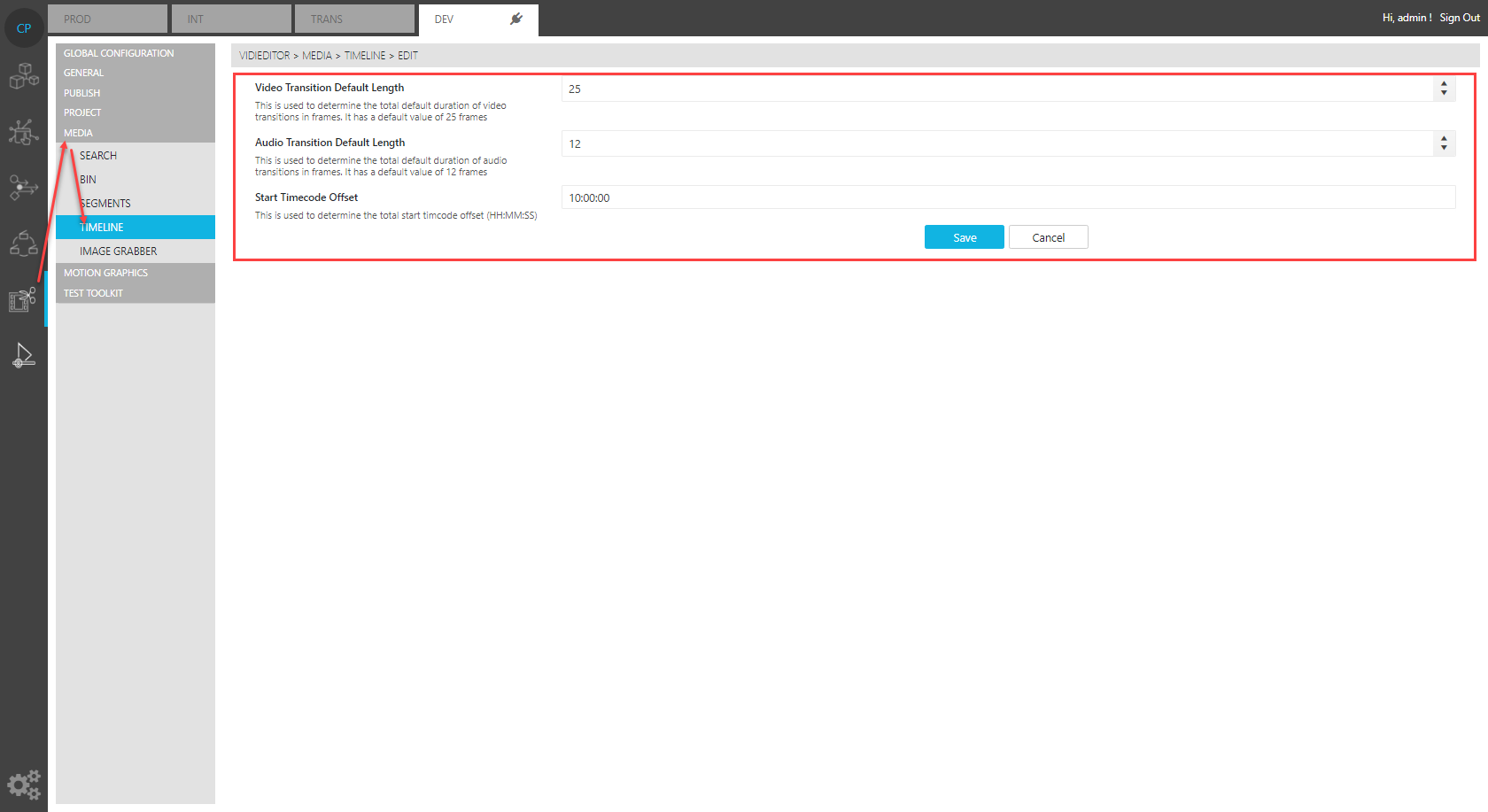This allows to set a default value as a timecode in HH:MM:SS that controls the start timecode of the timeline. On default a timeline would start at timecode 00:00:00:00 changing this parameter makes it possible to define that timelines start at a different timecode (e.g.: 10:00:00:00) when a user ceates a new timeline. Anyway the user is able to change the start timecode in VidiEditor GUI to whatever timecode is wanted afterwards.