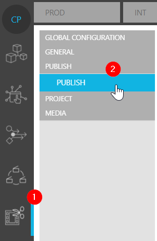 This area affects configuration possibilities for the publish dialogue (see also Publishing a Timeline Sequence [VE UG]). You can reach the this ConfigPortal use case page by selecting the VidiEditor in the main navigation bar and the option as indicated below. The configuration options available are used to customize the publish possibilities explained below switch by switch. Anyway this is the default configuration for the publish dialogue always used if no more specifically set configuration is made depending on the user group as explained in Publish Group Specific Dialogue (Enterprise) [VE OG] .