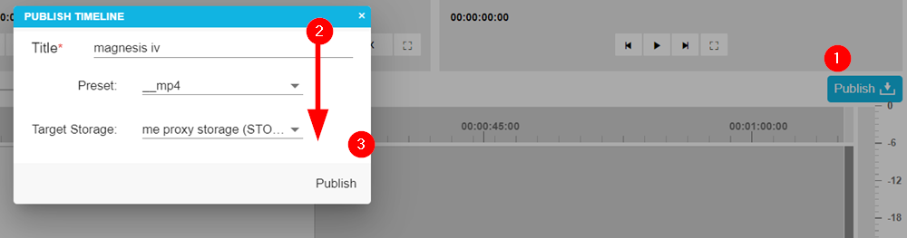 Whenever a user is finished with their editing project, they can choose to export their sequence into the media repository as new video file by selecting and clicking on the "Publish" button (1) located on the timeline's upper ribbon. Doing so will then prompt the Publish Settings window in which users are able to specify and define the settings (2) they wish to use. Clicking on Publish (3) will confirm the settings.