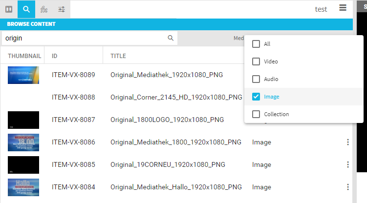 VidiEditor supports the usage of still images to be usable inside a timeline composition (see Supported Image Formats (Enterprise) [VE OG] and Supported Image Formats [VE OG] for list of supported formats). When having the option configured a user can find still images in the Browse/Search tab of the Media Management area like other media: