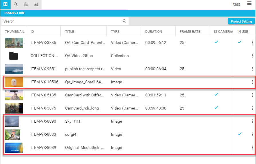 Inside the project bin the still images working with the same functionality such as video or audio files. So they have a preview thumbnail as well as metadata suitable to find the content. Images can easily be identified by the type column. Metadata without a dedicated meaning are left empty for images. Those are for example the duration or frame rate values. Images in project bin can look as illustrated in the following depending on the configuration of the bins result grid.