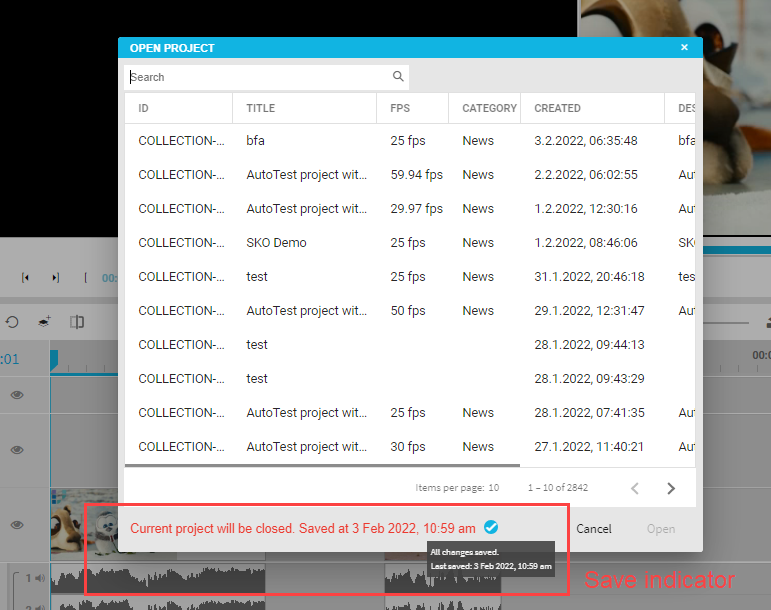 Whenever a user switches from one project to another while opening a new project or while creating a new project, the timelines save status is displayed with its timestamp. Also the user can click on the icon here again to manually save the project if wanted. Following figure illustrates this for the open project dialogue:
