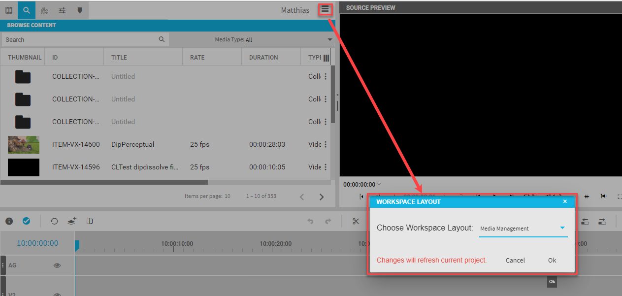 The workspace Layout can be set by the user via the VidiEditor burger menu: