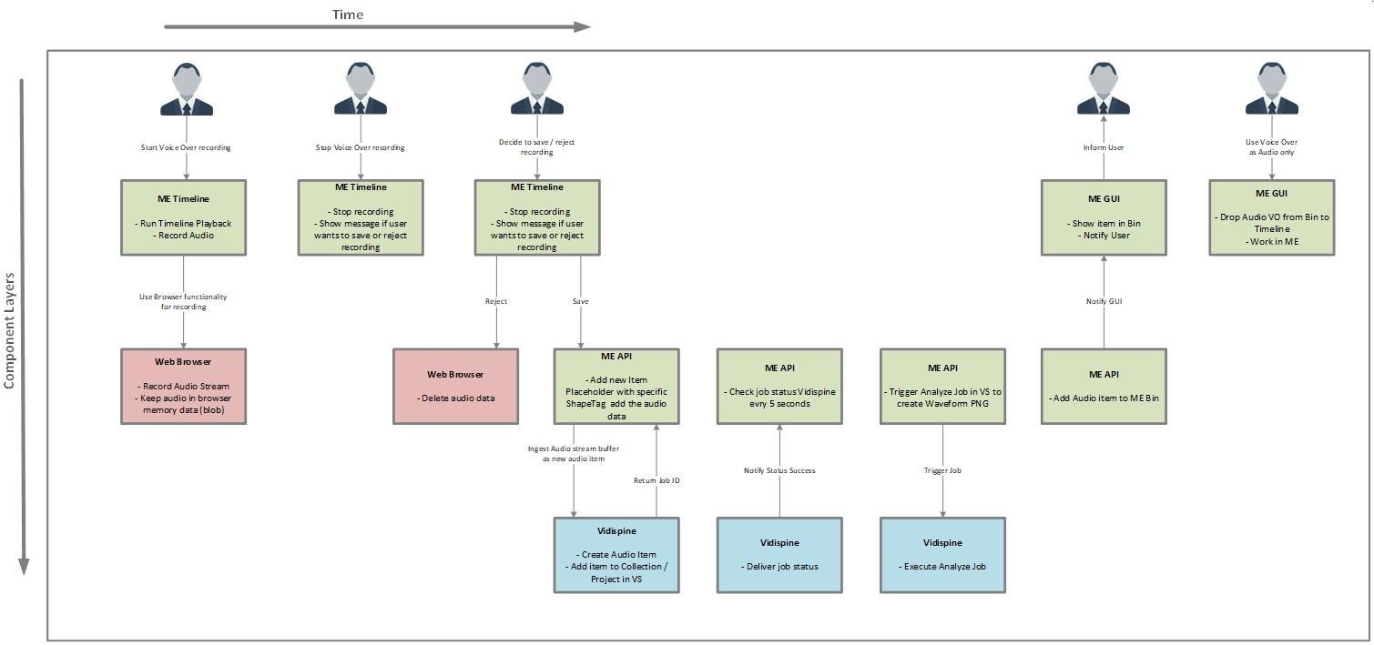 A common use case in video production is the use of voice-over recordings to speak on top of the video composition. This use case works out of the box after installation. The diagram below illustrates the interaction between a user and VidiEditor for the complete use case.