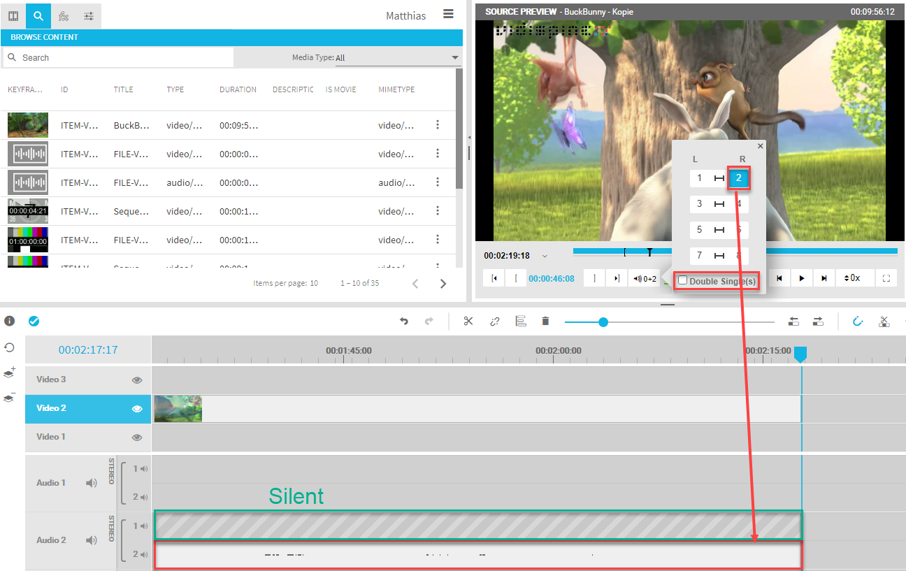 Please note that a specific configuration option “Direct Out“ can be used to bypass this behavior, which allows for rough cut editing using all audio channels of the source media. Please see Direct Out Publish Configuration [VE OG] for an introduction and implications using this feature.