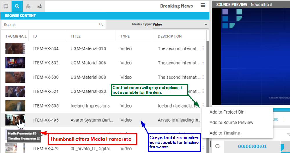 The video frame rate must match the project timeline's frame rate to be usable in the timeline and timeline preview player. If this is not the case, the user will get an info message that the frame rates are not matching. And those item will be greyed out in the search result as follows: