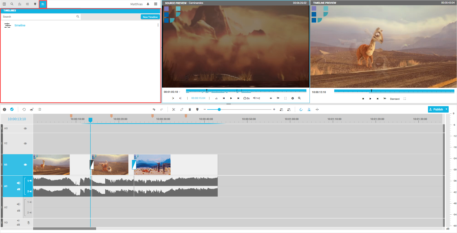 While often one timeline is enough for an editing project, in some scenarios it makes sense to have multiple versions of a timeline managed under the same project. This especially makes sense when the different timelines only differ in small aspects. As an example think about creating a timeline for traditional television content in 16:9 aspect ratio. This goes out into a studio situation on publish for example. As a second step the user wants to use the same timeline composition for a web distribution platform or social media such as Instagram or Facebook. As a result the same content may want to be used in the same way on the timeline , but vary in smaller aspects. Examples of this may be the use of cropping and the positioning of videos. Another example for this could be a scenario in which rights do not exist for some media and must be replaced with a still image or shortend.
