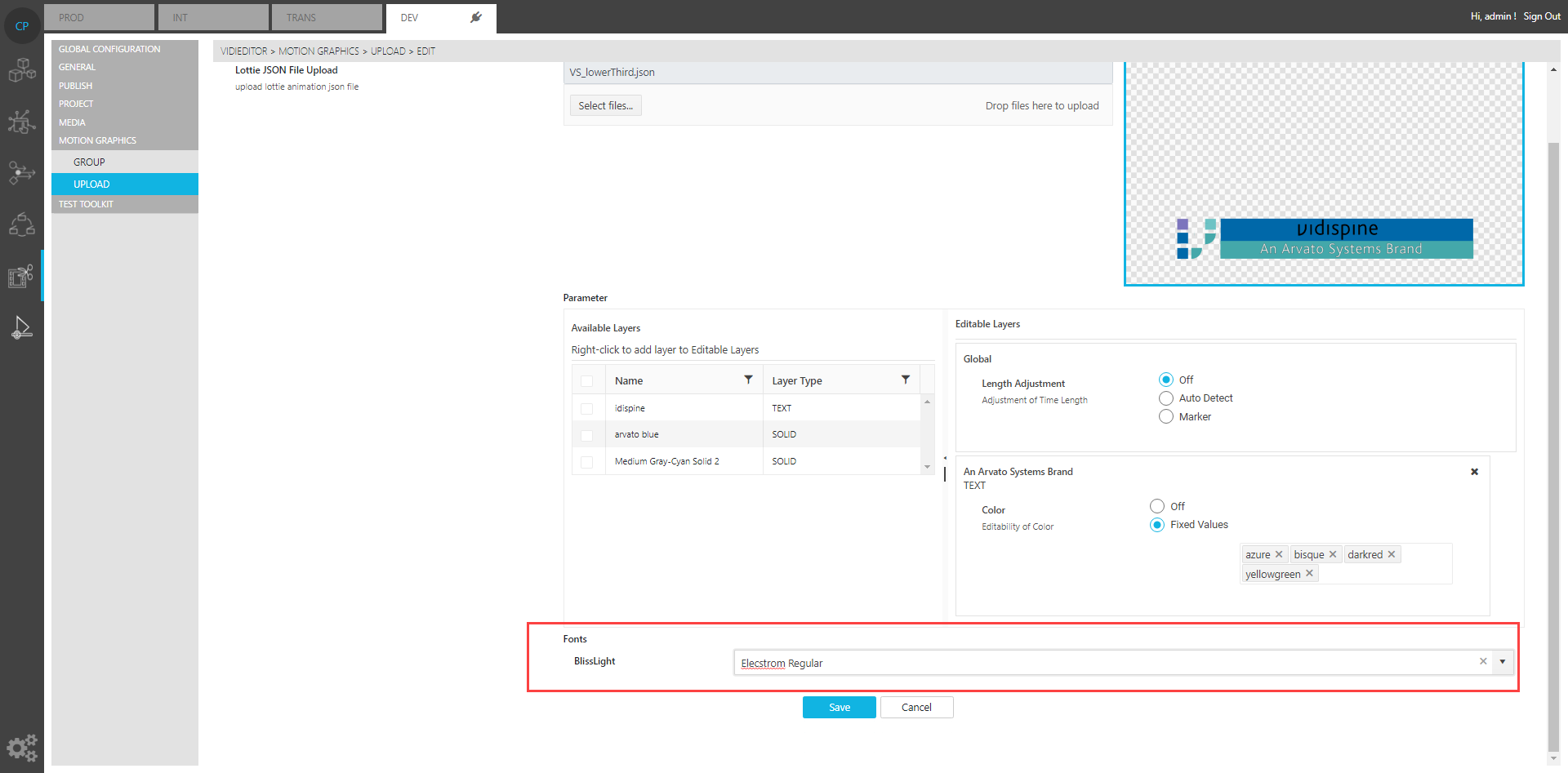 A Lottie compatible graphic animation file can be added as template to VidiEditor using the ConfigurationPortal: