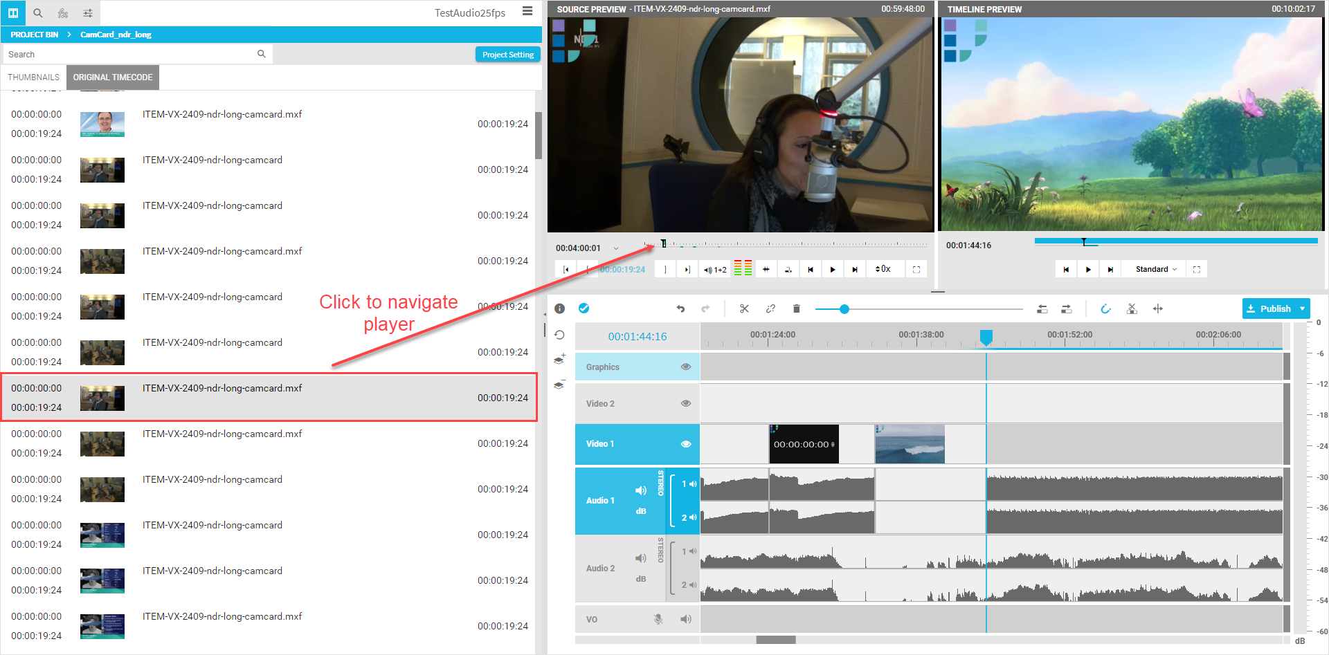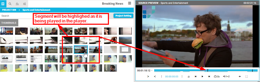 2. Navigate to event with a click. This allows one position the playhead of the player to the segment's IN position by simply clicking on the event. This enables the user to quickly find the content needed based on the event list.