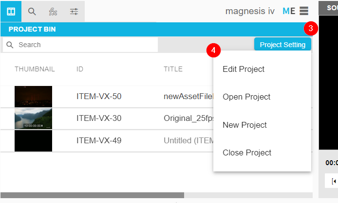 The Project Bin Tab contains all the media associated with a particular editing project, along with additional metadata and the possibility to carry actions from the context menu (1) for each item individually. The activities that can be carried out in the Project Bin are divided into the following topics: