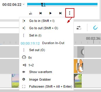 You will see a “Show More…” menu icon illustrated by three dots in case the resolution or space is not sufficient to show all VidiEditor player controls below the video. If you click on this icon, you see a menu containing all the hidden player controls. The controls will work exactly the same way like if they are shown below the player.