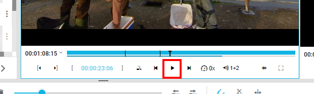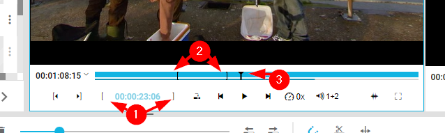 When adding media ot the timeline, editors may want to add only a partial clip instead of the entire media asset. In order to achieve this, the player's IN and OUT points can be used to specify which portion of the clip users want to insert into the timeline. The "Add in" and "Add-out" (1) buttons for setting the points (2) in the player's timeline, as shown below.