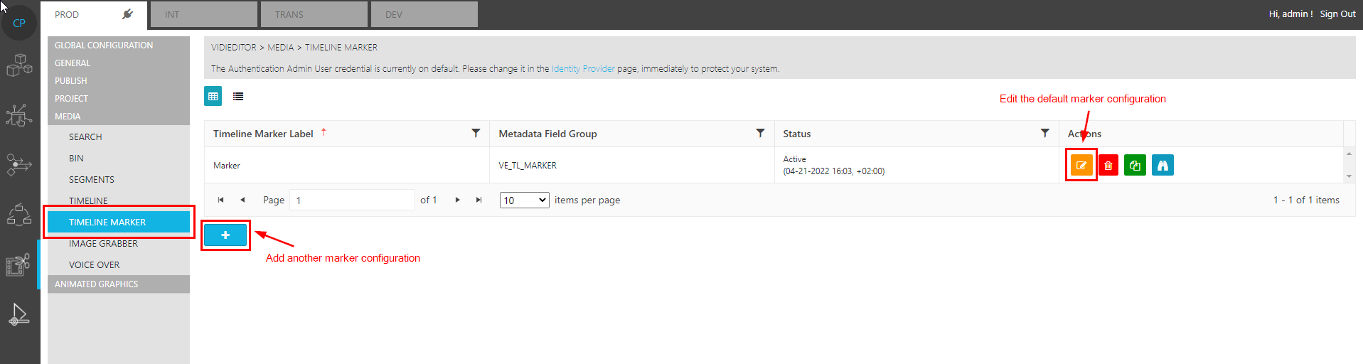 VidiEditor automatically creates a use case page called “Timeline Markers” with one default configuration called “Marker” during deployment in the ConfigPortal section: