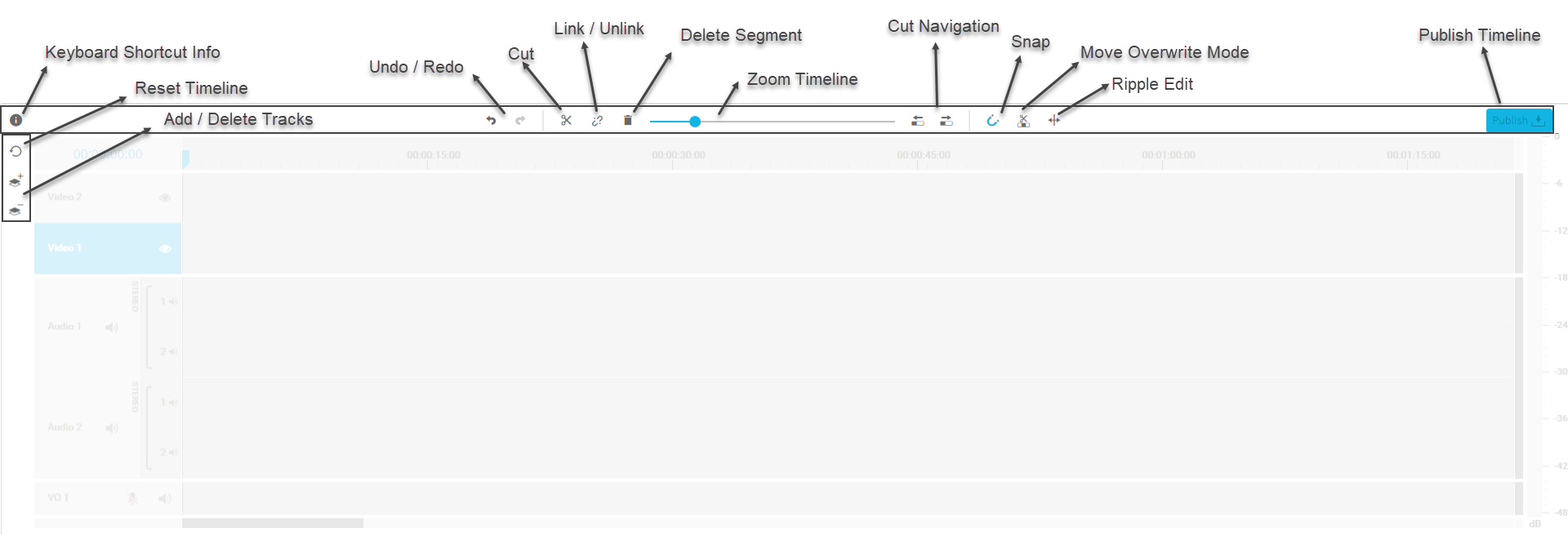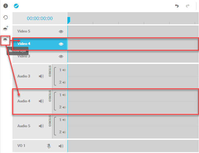 By default, VidiEditor projects are created with 2 video and 2 audio tracks. The “Add Track” button allows one to add up to 5 video and audio tracks. Audio and video tracks will be added and deleted together when adding new tracks so you will have the same amount of audio and video tracks. The Voice Over track cannot be controlled using those options. It is always available.