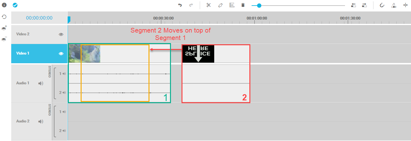 In order to better explain the difference between both modes, imagine a situation in which 2 segments on the timeline came into conflict. In this example, the user moves segment 2 (red) on top of segment 1 (green) so they overlap on the same timecode position and track (yellow):