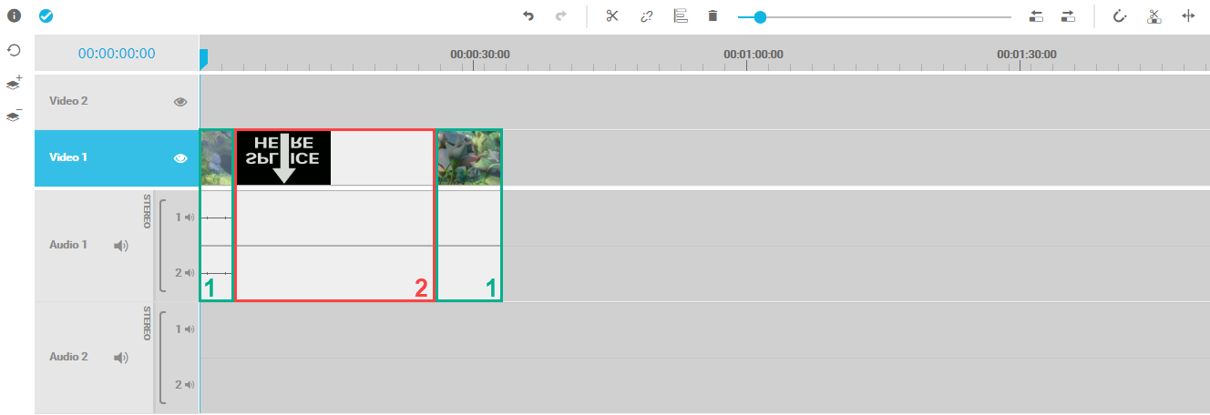 For this situation, the move / overwrite mode offers 2 strategies to solve this conflict which can cover a user’s typical requirements. In this example, the overwrite mode overwrites segment 1 with segment 2 for the complete duration of segment 2. As a result, segment 1 is split into 2 new segments and shortened by the duration of segment 2. This can be seen in the image below.