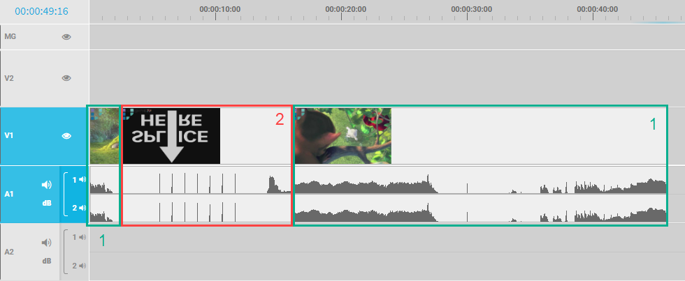 While this may make a lot of sense in many scenarios, it might be necessary to keep the content of segment 1 as it was without shortening the content. This can be achieved by using the move mode which will automatically cut the conflicting segment 1 on the in position of the dragged segment 2. Afterwards the remaining content from the cut position of segment 1 shifts to the out position of the dragged segment. The result of which can be seen in the image below.