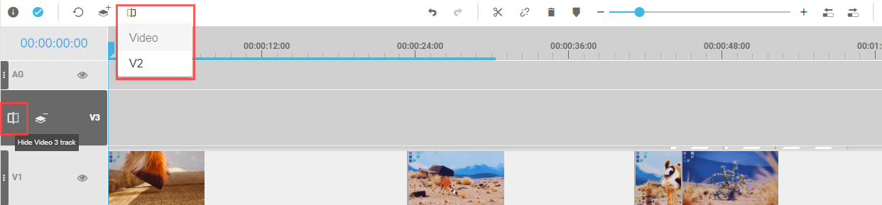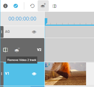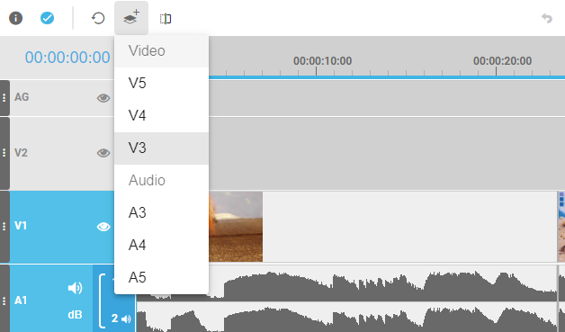 By default, VidiEditor projects are created with 2 video and 2 audio tracks. The “Add Track” button allows one to add up to 5 video and 5 audio tracks individually. The user just needs to select the wanted tracks from the dropdown being displayed when clicking the button to add them to the timeline.