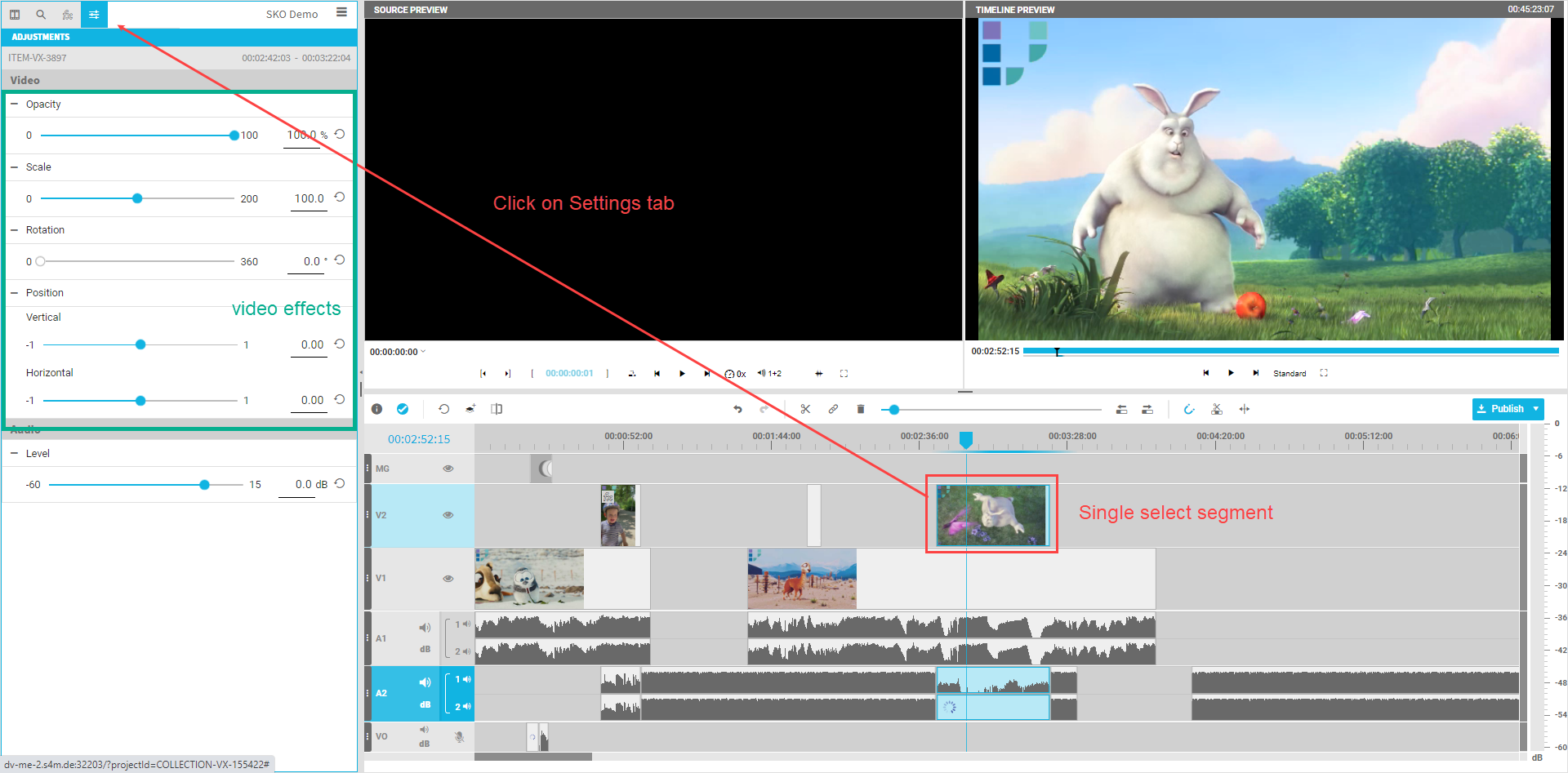 To use effects just select one graphical segment in the timeline and click on the settings panel of the Media Management area: