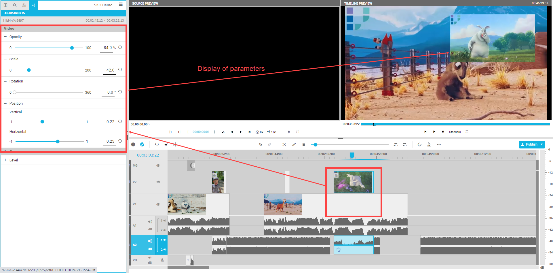 It is easy to adjust the parameter using a slider or while entering a value directly in the input field besides the slider. The result will be displayed in the timeline preview player.
