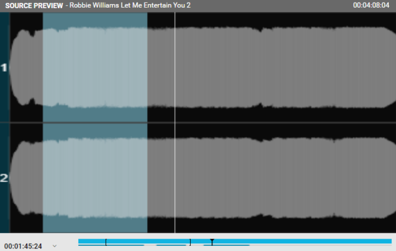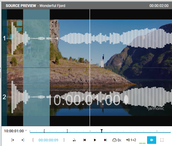 For audio only items the waveform view is displayed on default when loading the item in the player. The view displays all channels selected for playback as well as the in and out points set (blue highlighted area) and the playheads position.