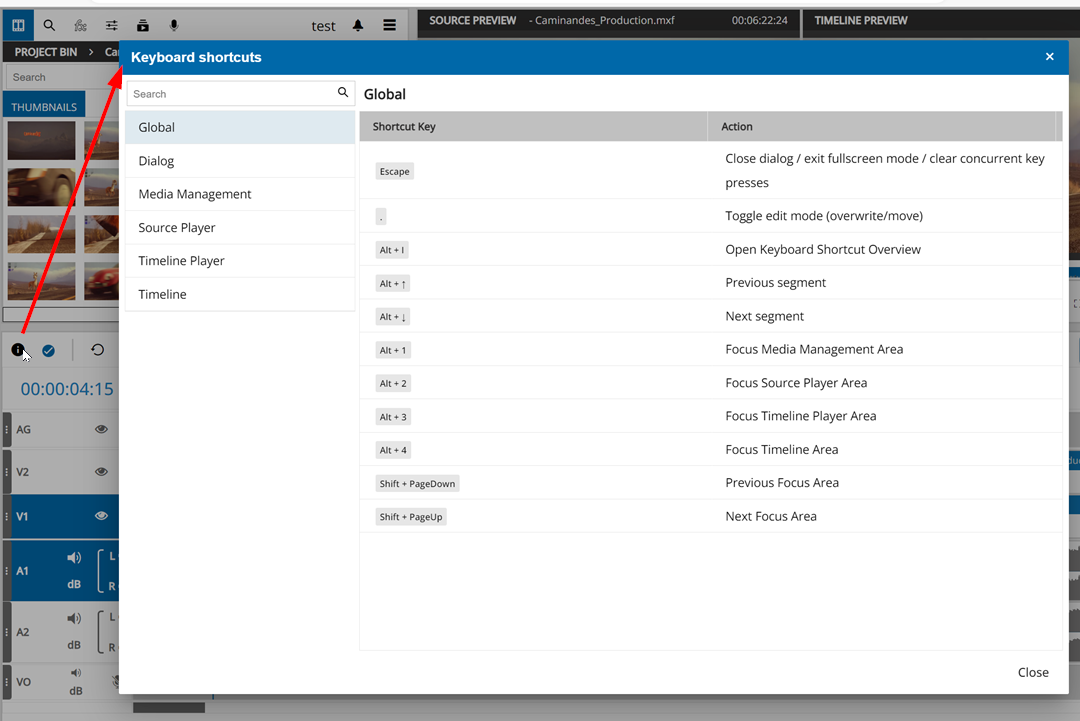 VidiEditor offers users a variety of keyboard shortcuts designed to increase the efficiency and reduce the effort of an editor's workflow. Clicking on the information icon will make all of the available keyboard shortcuts visible directly in the GUI to support the user finding and learning the available keyboard shortcuts.