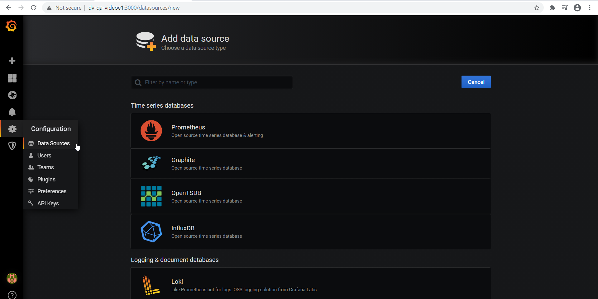 1. Once in Grafana, click on the "cogwheel" in the sidebar to open the Configuration menu.