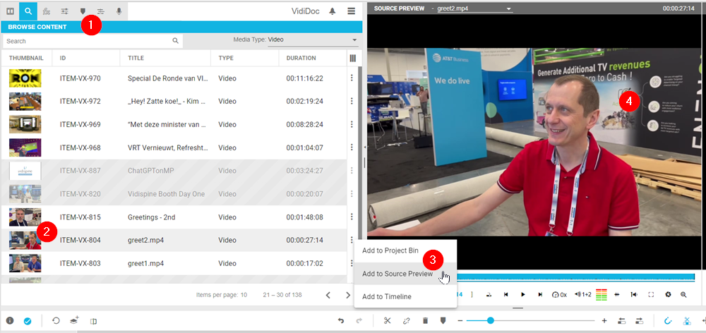 If users want to view the content of the clip itself, they can select and click on the context menu icon (2) and select the "Add to Source Preview" (3) option to view it in the Source Preview player (4). Alternatively, the video can be placed there via drag and drop (see also: Preview Player: Source Preview).