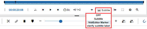 If a media item is loaded to the source player having metadata groups defined for subtitling (see Subtitles [VE OG]) the source player will display a control for selecting one of the available subtitles or to hide subtitles completely. If no suitable data exists, the control will be blend out. Selecting on of the presented lists will display the subtitle text in the video player on top of the video display. The appearance or formatting of the text will depend on appearance settings set on the metadata groups list. So VidiEditor tries to do display the text as close as possible to appearance settings set in the metadata group. Anyway this will not be exact as only a subset of formatting options can be supported and an auto line wrapping is implemented to show th text as good as possible on screen. In case no appearance settings are set the formatting will fall back to settings defined in ConfigPortal as described in: Subtitles [VE OG].