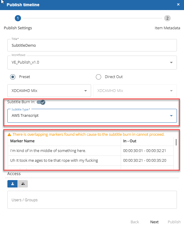 The user has an option to burn in the subtitle into the video outputted on publish. This means the text will be encoded to the video stream. The user can enable this option and choose one of the existing subtitle markers of the timeline: