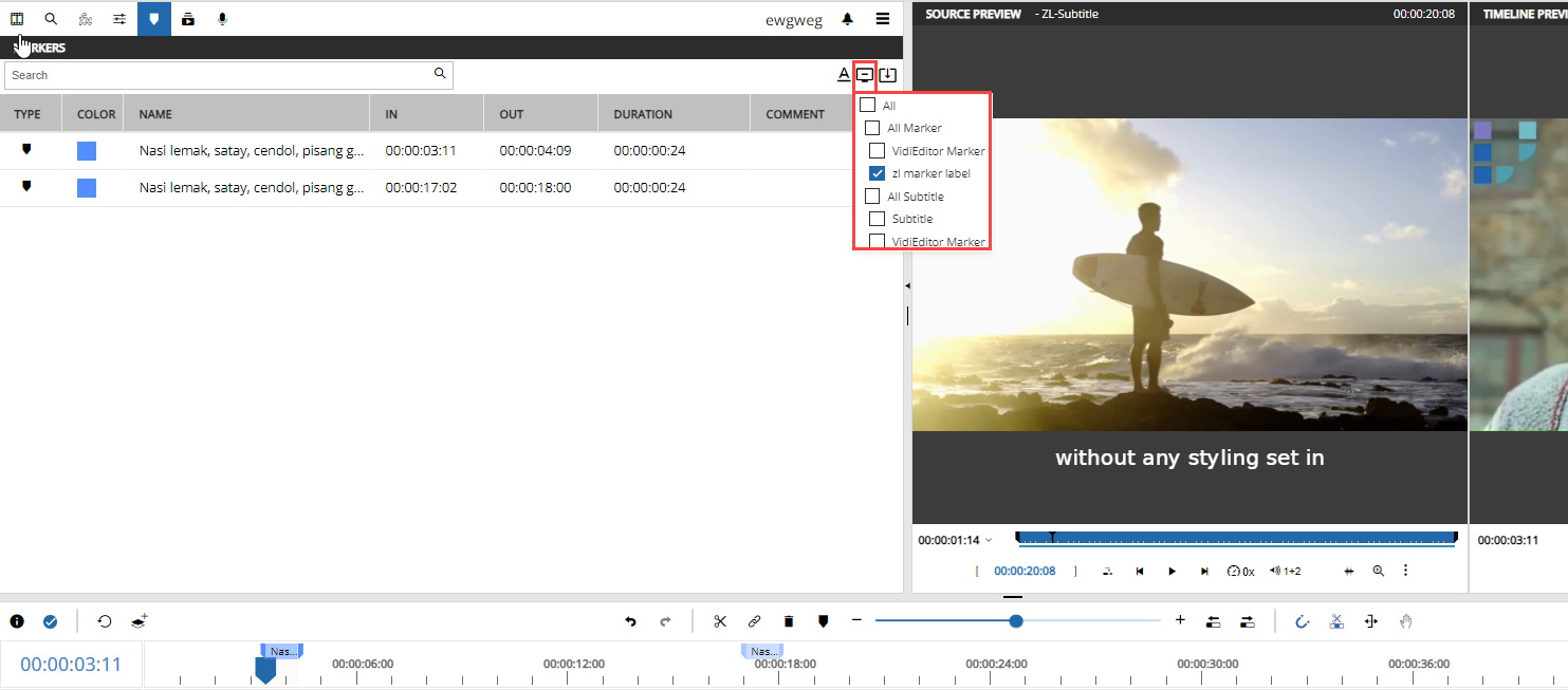 If markers are configured as subtitle source (see Subtitles [VE OG]) then some functionalities of the marker pane differ. In summation those are: