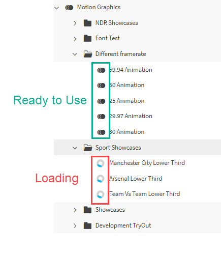 The templates can be found easily using the search filter. Adding them to the AG track can be done via drag and drop after the template is load from the configuration. While loading the template the VidiEditor will display a spinner wheel. Seeing the animated graphics indicator indicates that the animation is ready for usage.