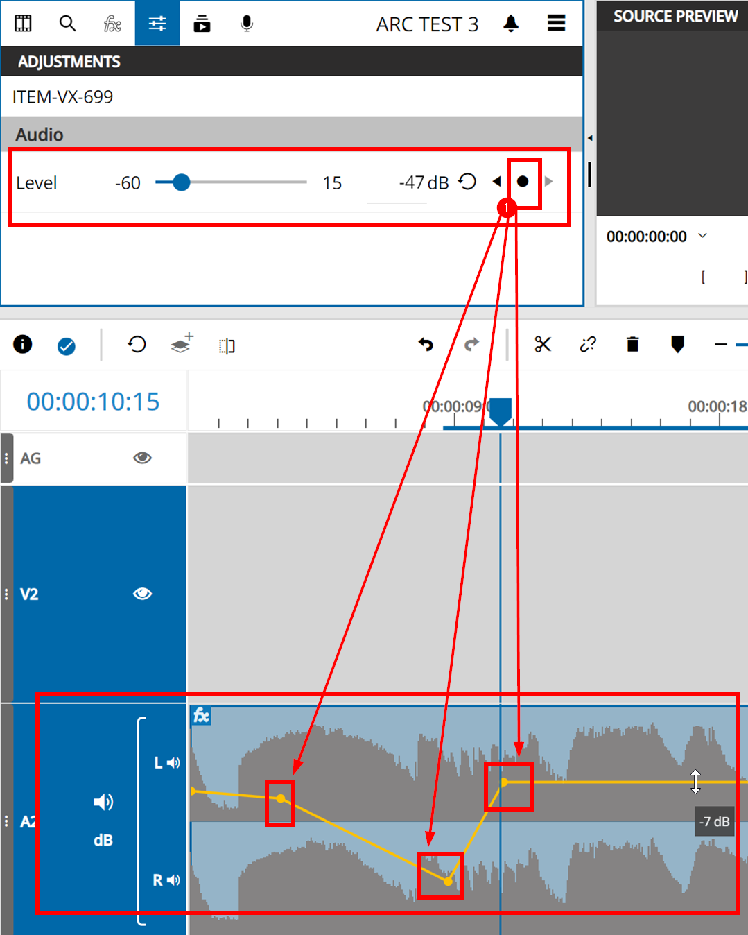 This will set a keyframe on the timeline playheads timecode position. It will show up as a dot on the level indicator line.