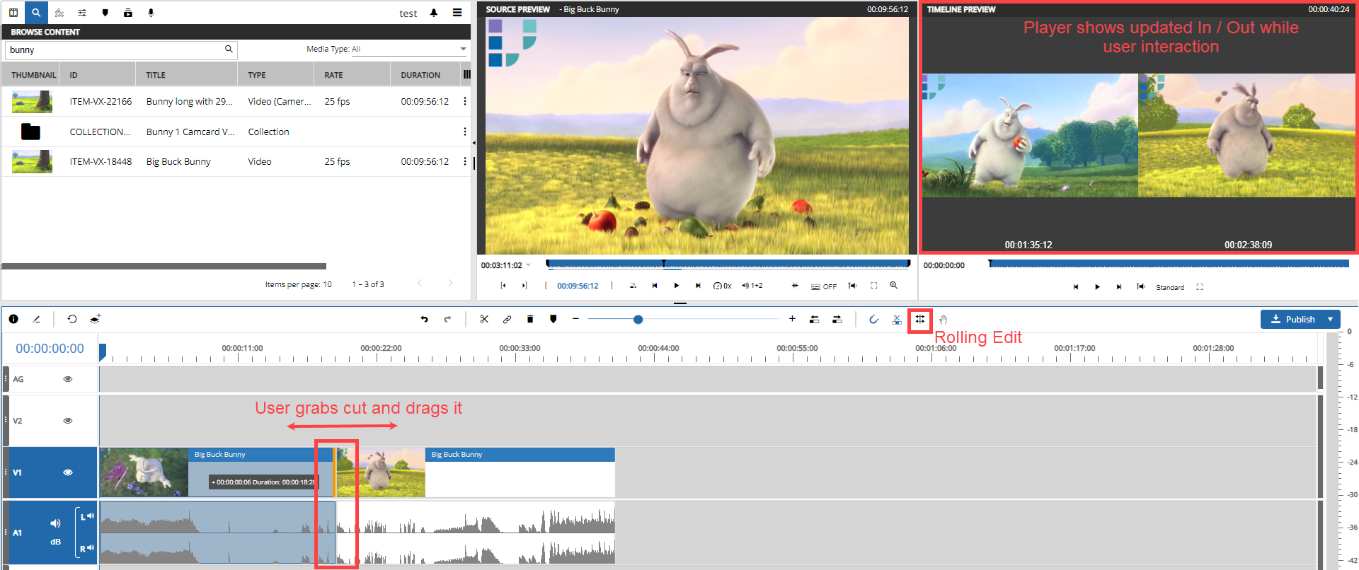 The ”Roll Edit” option can be turned on and off in the timelines toolbar. While on, users can trim the segments in the timeline in a way where the OUT point of one segment is trimmed together with the IN point of another segment in the same user interaction.