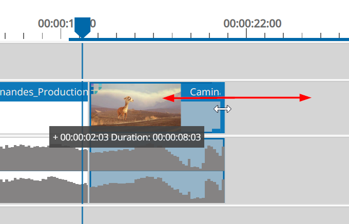 If one drags the segment with the bracket, it will be shortened or extended depending on the direction of the mouse movement. During this operation, a tooltip is displayed indicating the duration information of the trim operation and the timeline player will display a frame accurate live preview of the adjustment. Users are also informed when one tries to extend the length longer than possible.