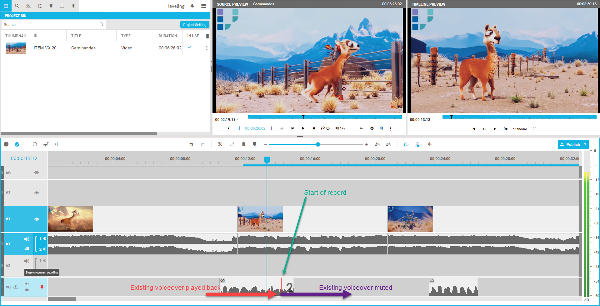 also an “In Use” indicator displays what recording are used on timeline. As soon as the user decides to ingest the local voice-over it will disappear from the voice-over pane and pop up in the bin as normal audio only item.