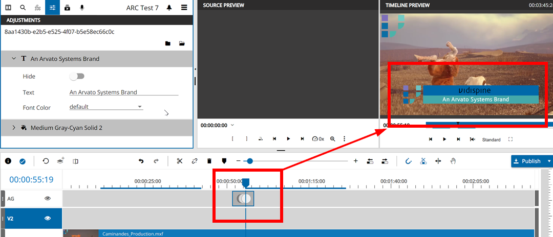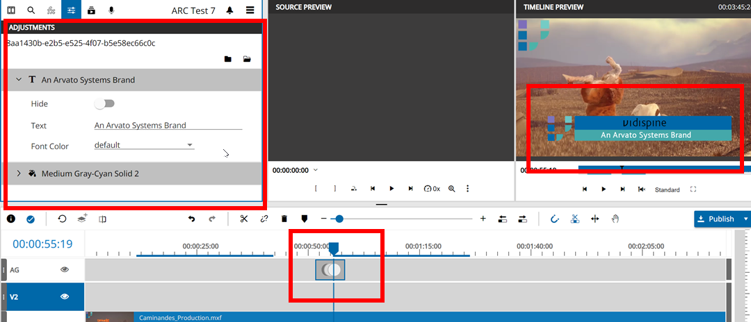 Selecting the animation segment and choosing Media Management → Settings pane will allow the user to adjust the parameters based on the configuration to for example change the text, change colors, hide layers or change the animations length.