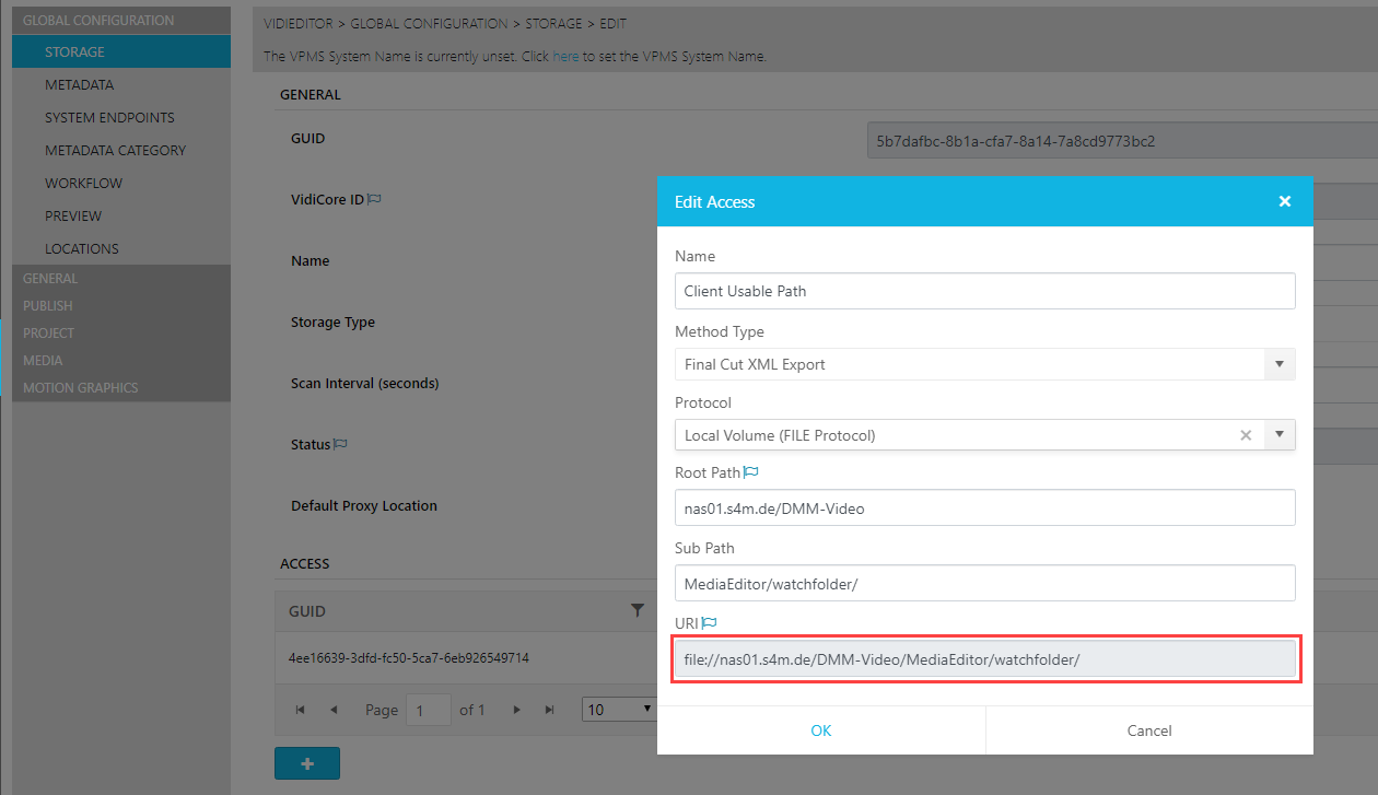 To ensure a client usable path is generated in the XML a dedicated storage method can be set that is used for generating those paths. This is possible in ConfigPortal → Global → Storage → Storage Method → Final Cut XML: