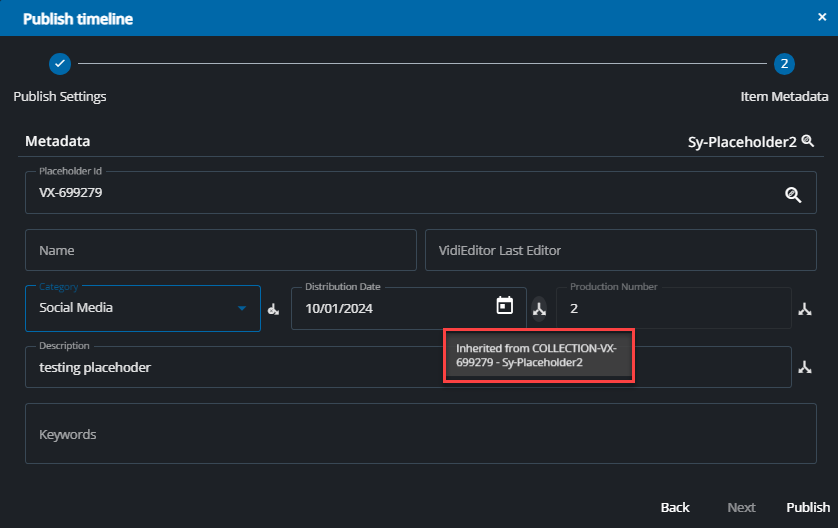 All metadata set for inheritance in the global config will be inherited to the item when publishing. Inside the publish dialog already a subset of metadata might be displayed that inherits metadata from the placeholder to the item. This is indicated via an icon besides inherited metadata: