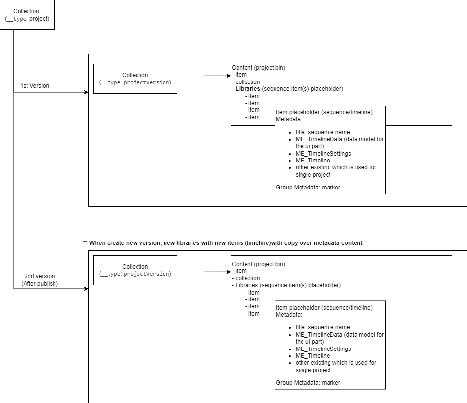 Each Version/sub-collection will hold a library which use to keep track the timeline (store as an item)