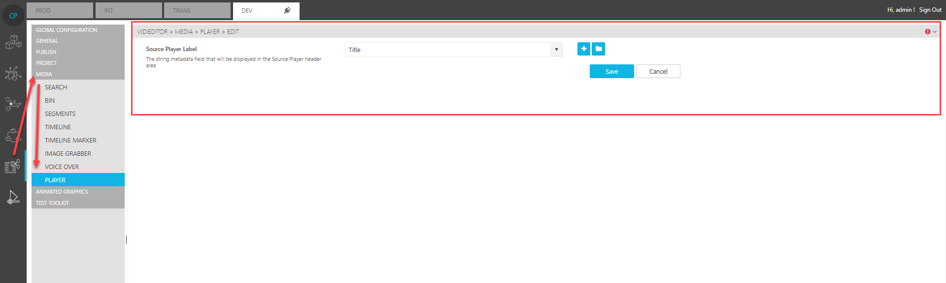 This setting allows one to specify which item’s metadata field is loaded in the Source Player. By default, VidiEditor will display the Title metadata. This is also expressed in the player’s dropdown as explained in Last Opened Items.