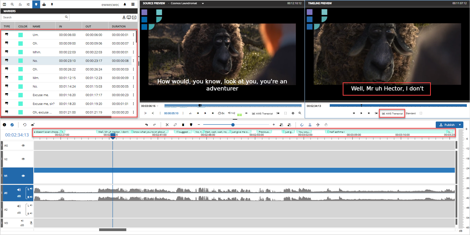 Subtitles occur as source media events as well as timeline markers