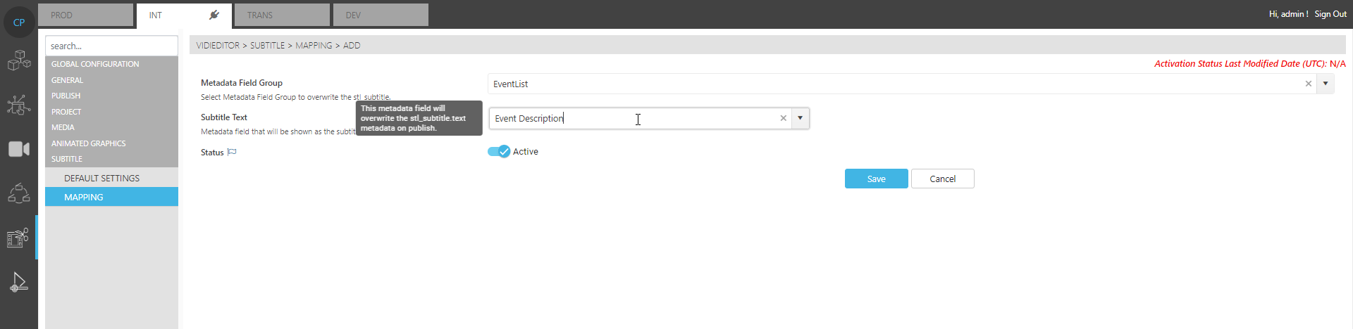 Config Portal → VidiEditor → Subtitle → Mapping