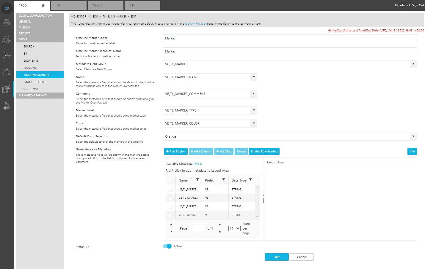 When one clicks on the edit button next to the Marker configuration page, the ConfigPortal editing page will be opened. This page shows all metadata fields and colors that will be shown to the VidiEditor user when opening the Timeline Marker Edit dialog. Per default the page looks like this: