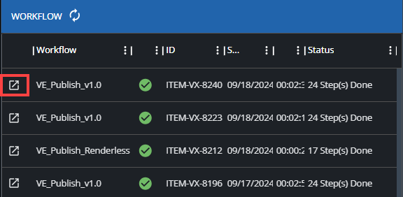 The most general purpose is to display all relevant workflows in a grid view presenting the technical workflow name as well as the state and most basic information such as start time or amount of steps. This is a compressed view displaying the workflow triggered from the GUI directly, anyway it does not display details about sub workflows, tasks inside a workflow or the chain that was run through. If this is of interest the user can easily link into the VidiFlow workflow monitor using the button in first column. Simply click on the button to open a link to the workflow in VidiFlow monitor with all available details: